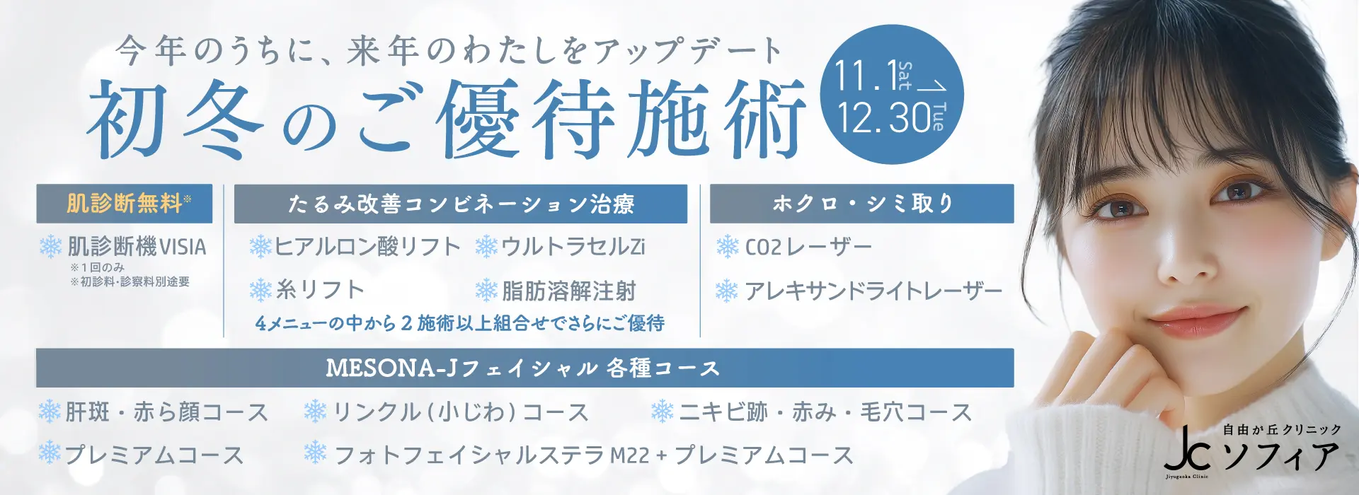自由が丘クリニックソフィアは、医師の管理のもと、安心してお受けいただけるメディカルエステを併設しております。