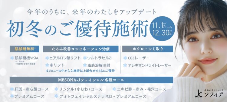 『初冬のご優待施術』では、施術を組み合わせてたるみを改善する「コンビネーション治療」、紫外線がやわらぐ季節におすすめの「シミ治療」、そして幅広いお悩みに対応する浸透美容「MESONA-Jフェイシャル」各種コースなどをご用意しています。さらに、ご希望の方には肌診断機「VISIA」を1回無料でご体験いただけます。